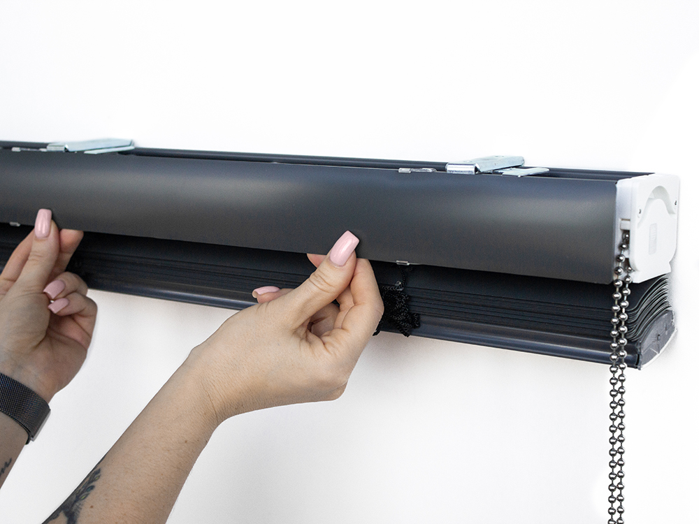 Отцентруйте валанс по отношениюк карнизу. Поднесите валанс к карнизу и установите его с помощью застежек или магнитных креплений.