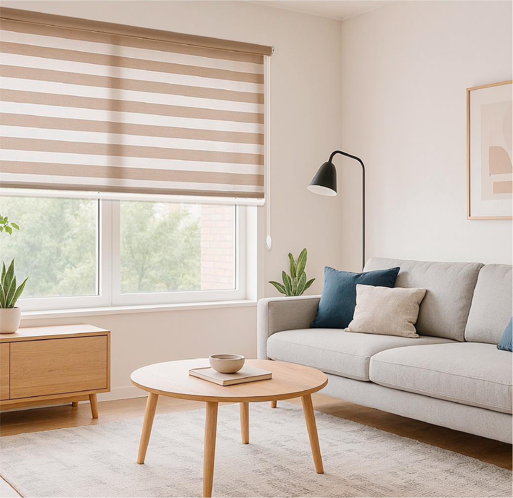 Сложенное вдвое полотно ткани системы CLIC DUO имеет чередующиеся горизонтальные прозрачные и непрозрачные полосы, которые при движении материала либо совмещаются, либо перекрываются. Благодаря такому смещению полос ткани относительно друг друга можно регулировать степень светового потока и уровень зрительного обзора. Для того чтобы выглянуть в окно, достаточно совместить одинаковые полосы материала, не поднимая полотно ткани полностью.